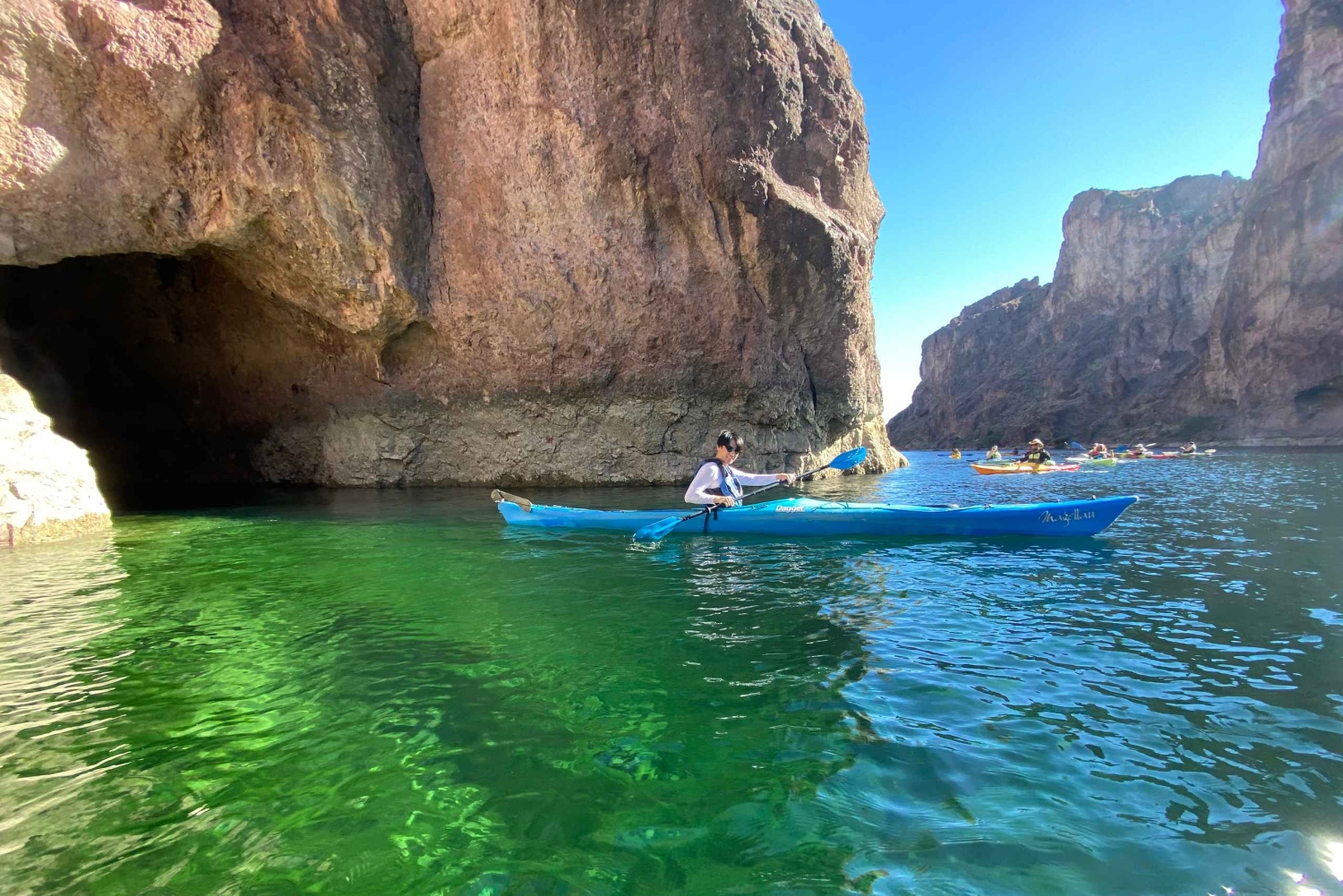 Wees klaar en vroeg om Las Vegas te verlaten voor een kajaktocht van een hele dag op de machtige Colorado-rivier. Ervaar de omvang van de Hoover Dam terwijl je hem vanaf het water bekijkt. Bewonder de aanblik van dit door de mens gemaakte wonder dat tevoorschijn komt als je 1100 voet in hoogte daalt en de voet van de dam bereikt. Peddel op een langzaam stromende rivier langs de Fish Hatchery op weg naar een historische trailhead. Strek je benen en maak een korte wandeling naar het River Gauger's Home, waar je meer te weten komt over de Colorado-rivier. Na de wandeling ga je naar Emerald Cave, een verborgen kanaal waar je het groene water van de Black Canyon ziet. Ga vervolgens met je gids naar Sandy Beach voor meer ongelooflijke uitzichten en fotomomenten voordat je naar je laatste stop, Willow Beach, gaat. Onderweg moet u zeker uitkijken voor het bekijken van dieren in het wild. Krijg de kans om regenboogforel, Amerikaanse zeearenden, dikhoornschapen en nog veel meer te spotten. Geniet tijdens deze reis van een lunch, tal van smakelijke snacks, fruit, mineraalwater en gebruik van een lichte toerkajak, reddingsvest en carbonlichtpeddel.Includes