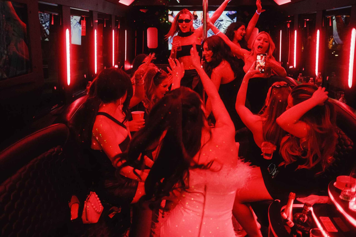 A derradeira experiência para elevar o nível da tua viagem a Vegas! O teu grupo + salão panorâmico + autocarro de festa privado abastecido com bebidas de cortesia + paragem para fotografias do letreiro de Las Vegas + entrada gratuita na discoteca = uma noite épica.